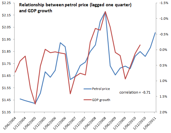 I took the MED’s petrol data and got the average price for 91 in each quarter since they started publishing the numbers in 2004, inflation-adjusted, and compared it to the GDP growth rate. The link was strongest when I lagged the petrol price by a quarter, which makes sense because it takes time for changes in petrol price to change consumer behaviour and other prices.