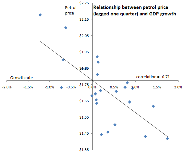The formula for the trend line crosses zero at $1.77. Of the 8 quarters in which petrol has averaged over $1.77, 5 were followed by a quarter of recession and the other 3 were followed quarters with 0.1% growth. Of the 17 quarters where petrol was below $1.77, the economy shrank once in the following quarter, was flat once, and grew 15 times. The correlation is -0.71, which is strong.