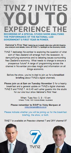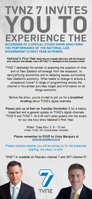 I didn’t even know until watching the Campbell Live story that David Cunliffe and Roger Douglas will be in the debate too. They’re not even mentioned in the invite. But English is and there’s a picture of him. In fact, he’s portrayed alongside Guyon in the same pose – like they’re both trusted news sources.