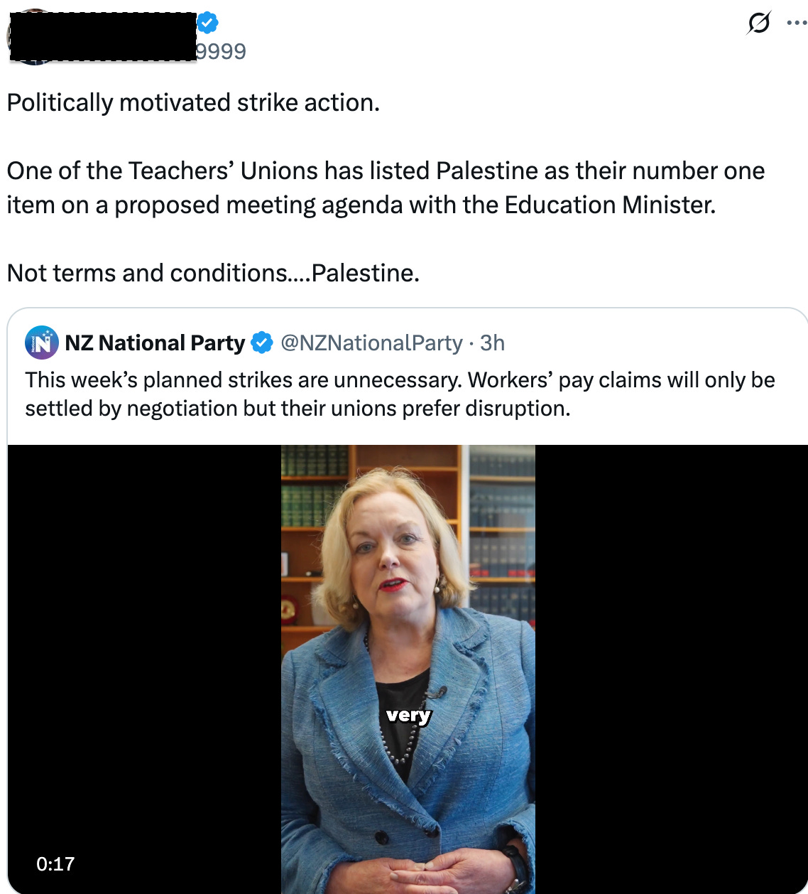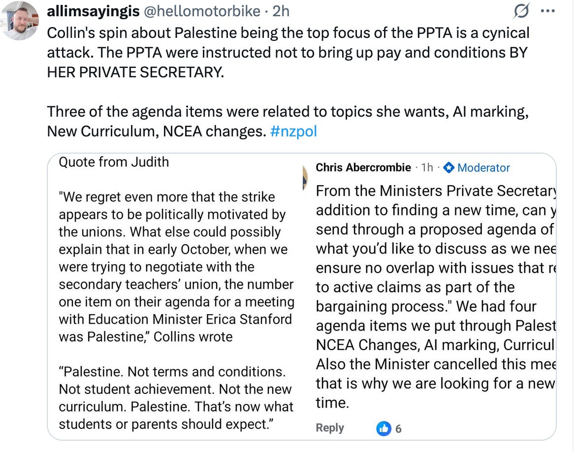In fact, Judith Collin’s Private Secretary instructed the PPTA to bring agenda items outside of pay/conditions. And subsequently the teachers named a few including AI marking, NCEA, and Palestine.