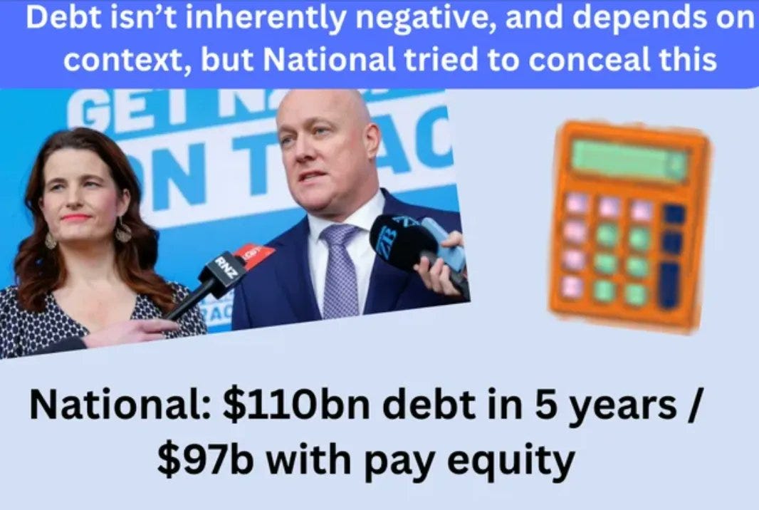 But Collins uses Labour’s “debt myth” to say this is the reason National can’t pay our doctors, and nurses, or agree on safe staffing levels and adequate resourcing – which is their primary concern.