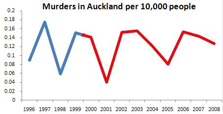 Akdnut. The number of homicides in Auckland is not up. Look at the stats. OK, I know you won’t so I’ve made you the graph, see the post again.