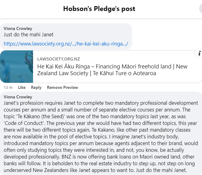 Dear, old Janet Dickson. Too racist and afraid to go to a 90 min Tikanga course, now threatening Harcourts (one of the most Pakeha institutions in the land, no doubt) with a Hobson's Pledge backed judicial review costing $150K.