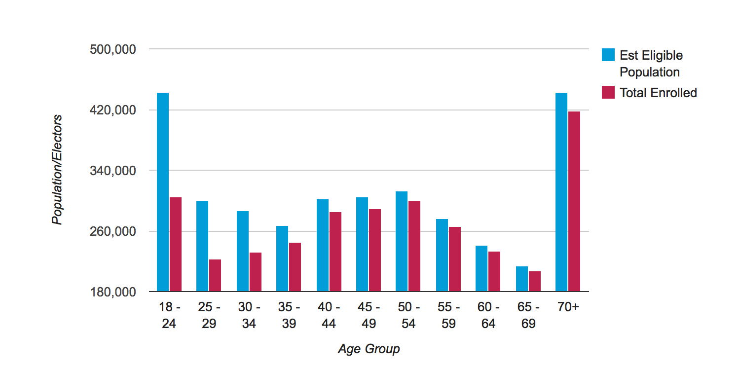 I suspect that not only will the lowest registration be with the younger age groups but, also, the lowest proportion of registered voters who don’t turn out at the polls will also be at the younger end.