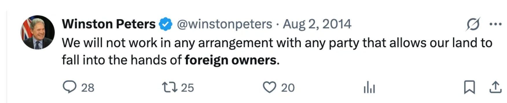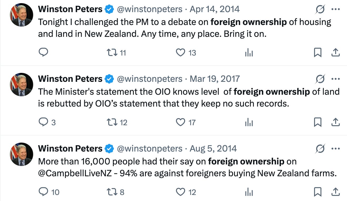 As Dame Ann Salmond points out, this government Coalition have collectively agreed to remove the special ‘benefit to New Zealand’ test, and the compulsory ‘investor test’ in the Overseas Investment Act Bill.