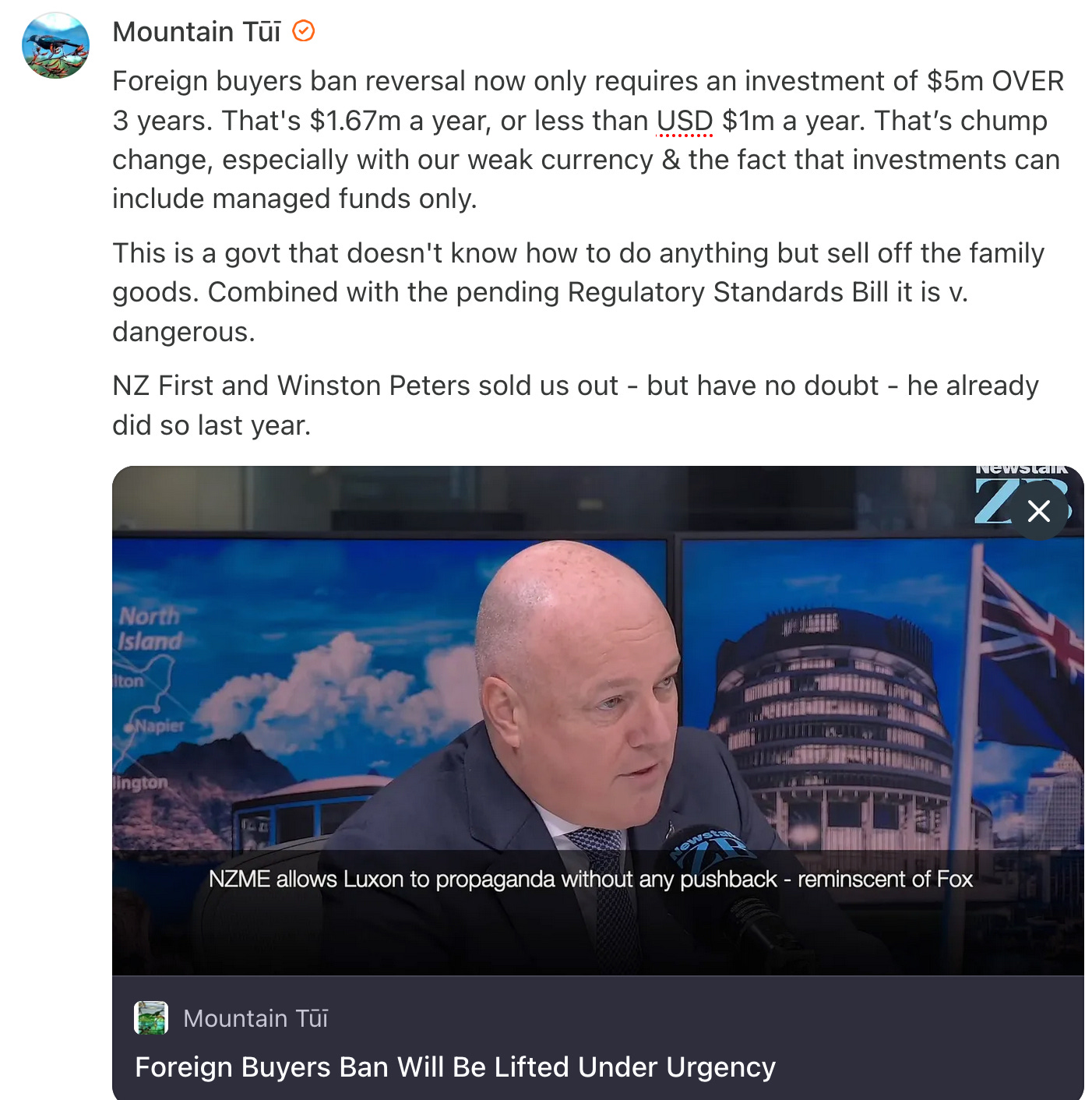 Don’t forget – it’s not just expensive homes they are selling off to the likes of Kim Dot-Com, Elon Musk, Peter Theil types: it’s our sensitive lands and assets such as farms, forestries, conservation land in terms of their legislative agenda, and the like.