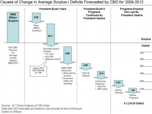 This table shows that the main causes of the current deficit, against the surpluses projected when Bush Jnr came to power, are tax cuts: