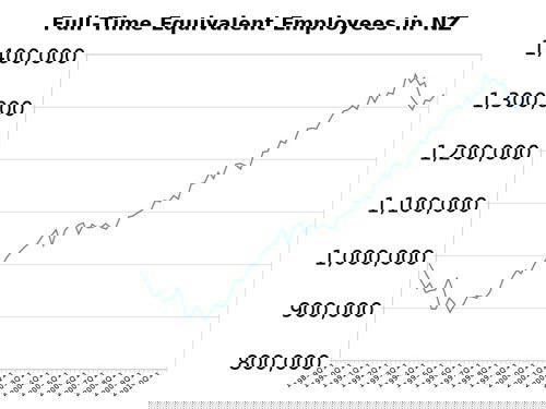 This shows the number of full-time equivalent employees (e.g. Two half-time employees count as one). The last two years saw the biggest dip in employment since Ruth Richardson.