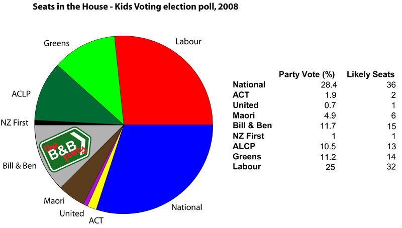 I’m not going to find all the stats and do the math myself, but it would be interested to see what the election result would be if these teenagers had the right to vote and had done so the same way they did in this exercise, wouldn’t be impossible, just find the percentage of high school aged New Zealanders, treat this as a poll and extropolate from there, then add it to the total of the actual vote and work out the percentage. (probably another step or two I’m forgetting)