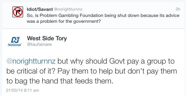 This is awful. The government has cut funding to the Problem Gambling Foundation, and National MP Tau Henare says on twitter it is because the PGF “criticises” too much.
