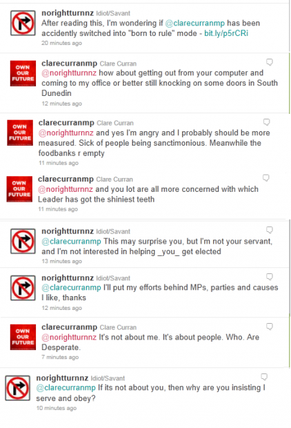 Nobody is complaining that Curran said something “contrary to spin”: we’re complaining because she acted like Labour voters becoming Green voters is some huge injustice tantamount to “undermining” Labour, and when called on that attitude she threw a tanty and started using other people’s sob stories to get sympathy.
