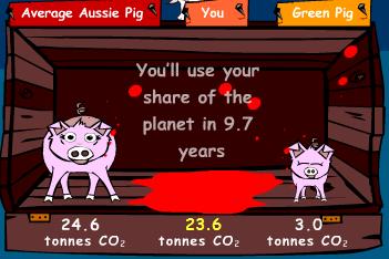 At the end of the questions your pig explodes rather bloodily and text appears telling you how many years it would take you to use up your lifetime (77 years) allocation of sustainable emissions. The average Aussie uses their allocation in 9 years.