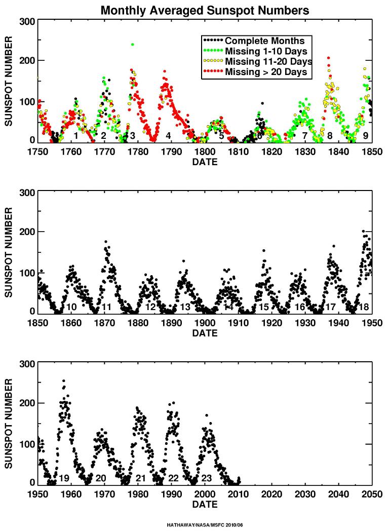 Should be pretty standard data sources. I picked large chunks of this off NASA after I read a yahoo post. The sunspot data is ultimately from the collection point in Belgium. All of the data is pretty much available on the net these days. (of course there is the underlying question of the net handling the subject 🙂 )