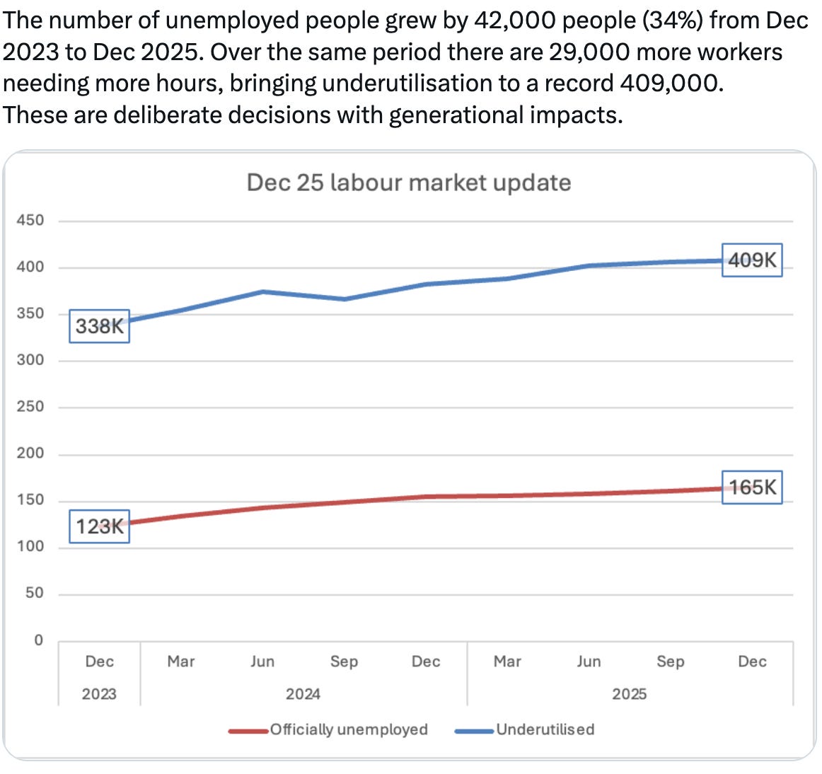 But the truth is even more grim – the unemployment rate is made significantly higher because it masks the 140,000 + Kiwi citizens we’ve lost in the last two years.